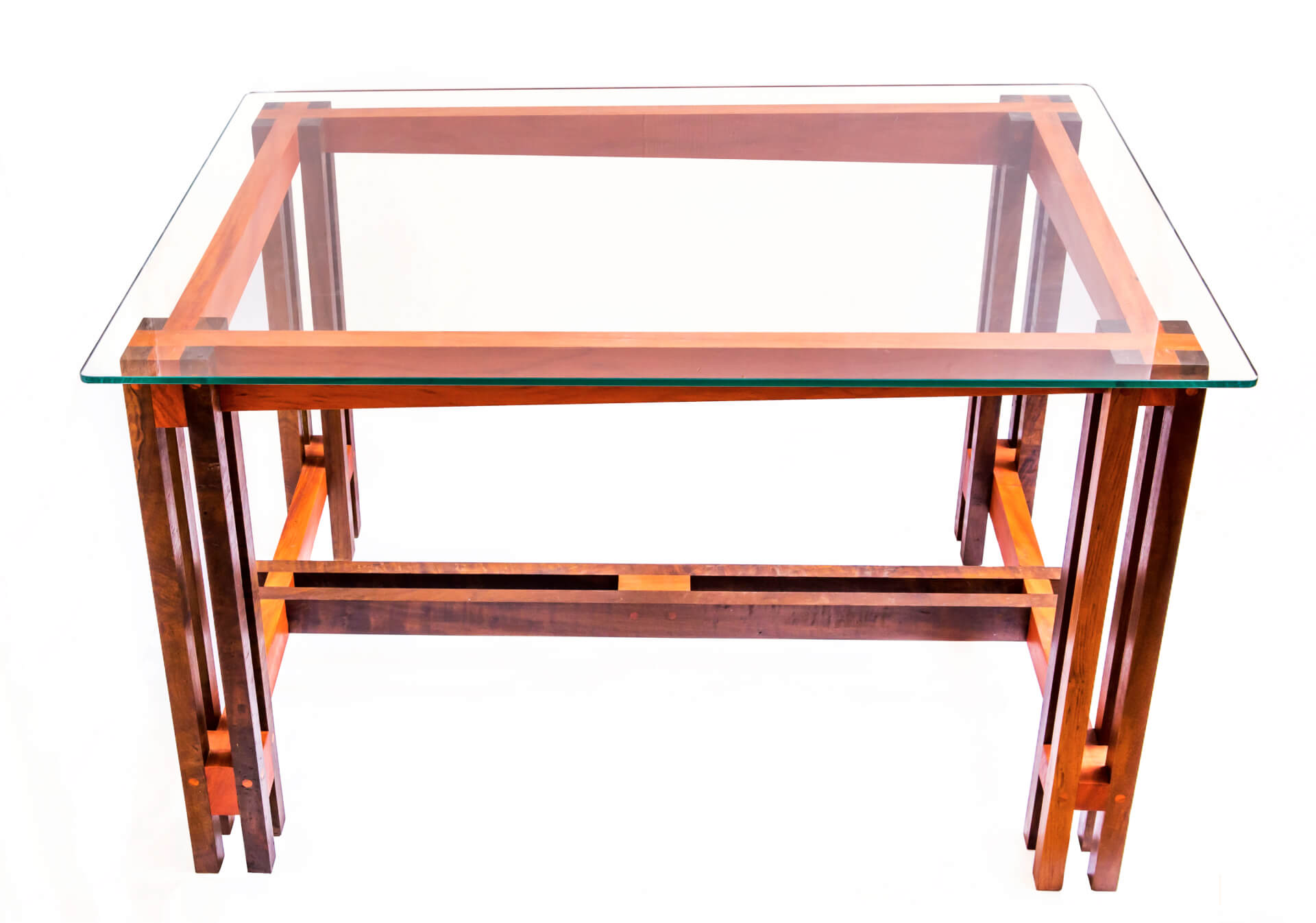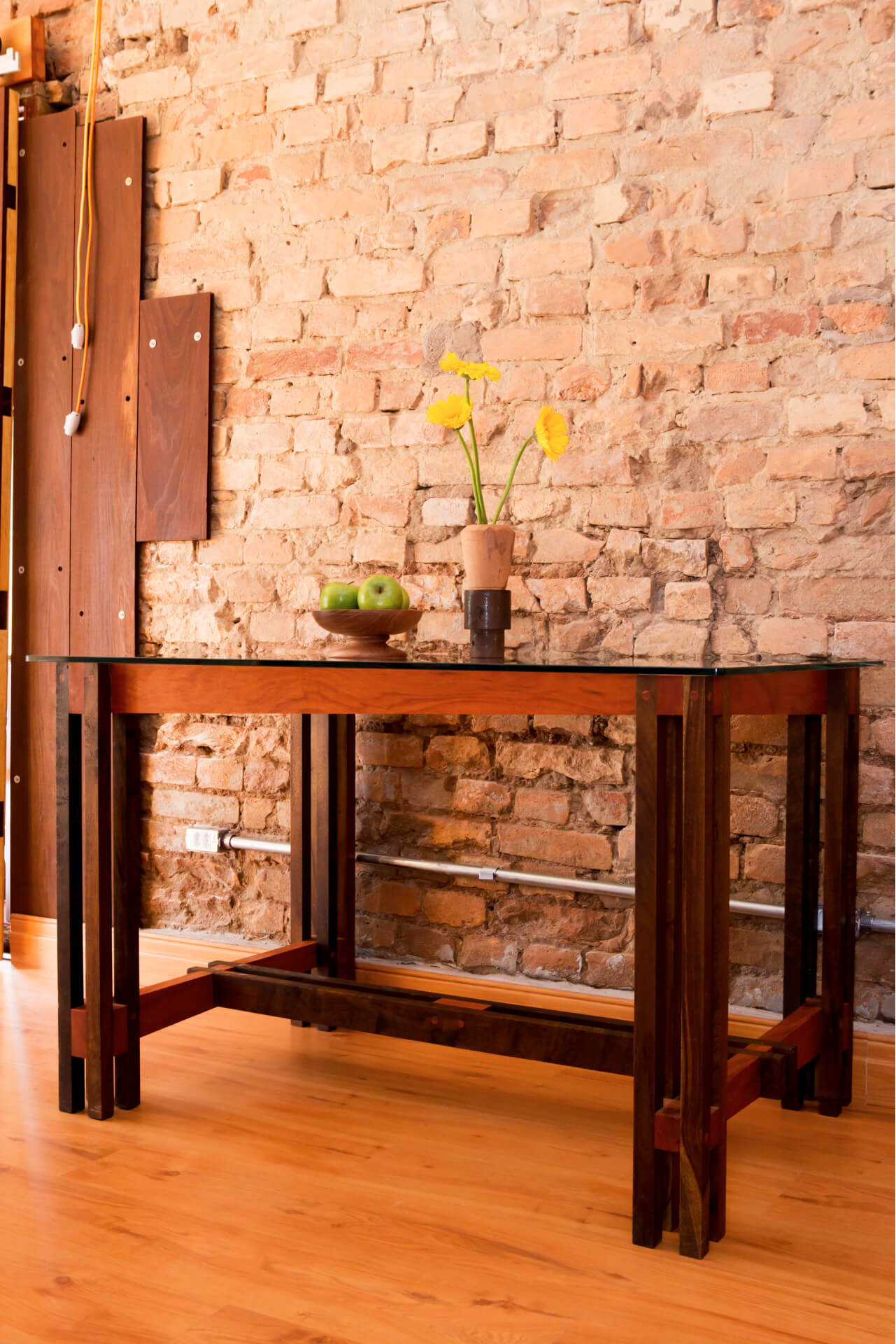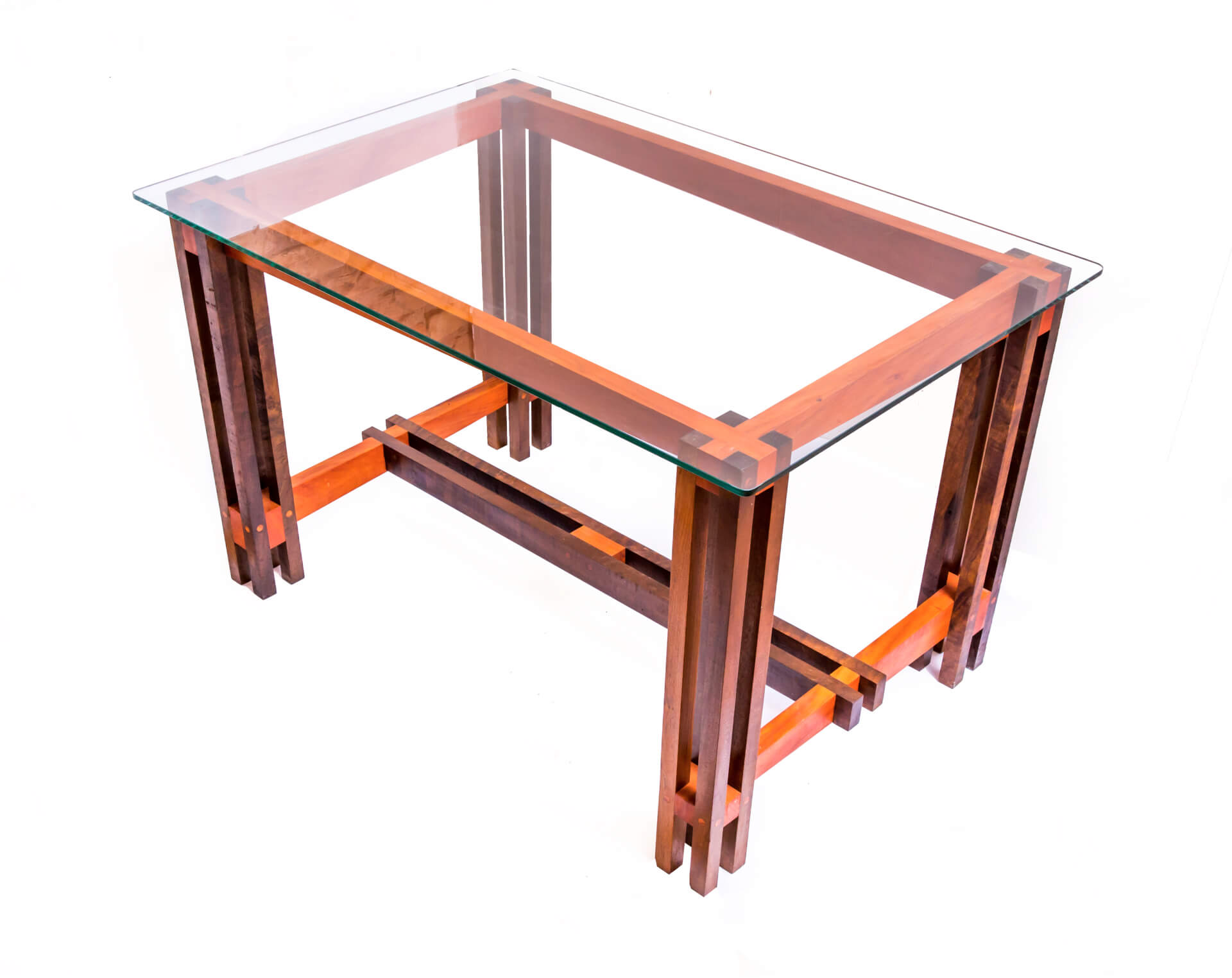 Elegante e robusta, sua estrutura exposta trabalha com os elementos vazados em seu desenho, pode ser utilizada como mesa de jantar ou mesa de trabalho.