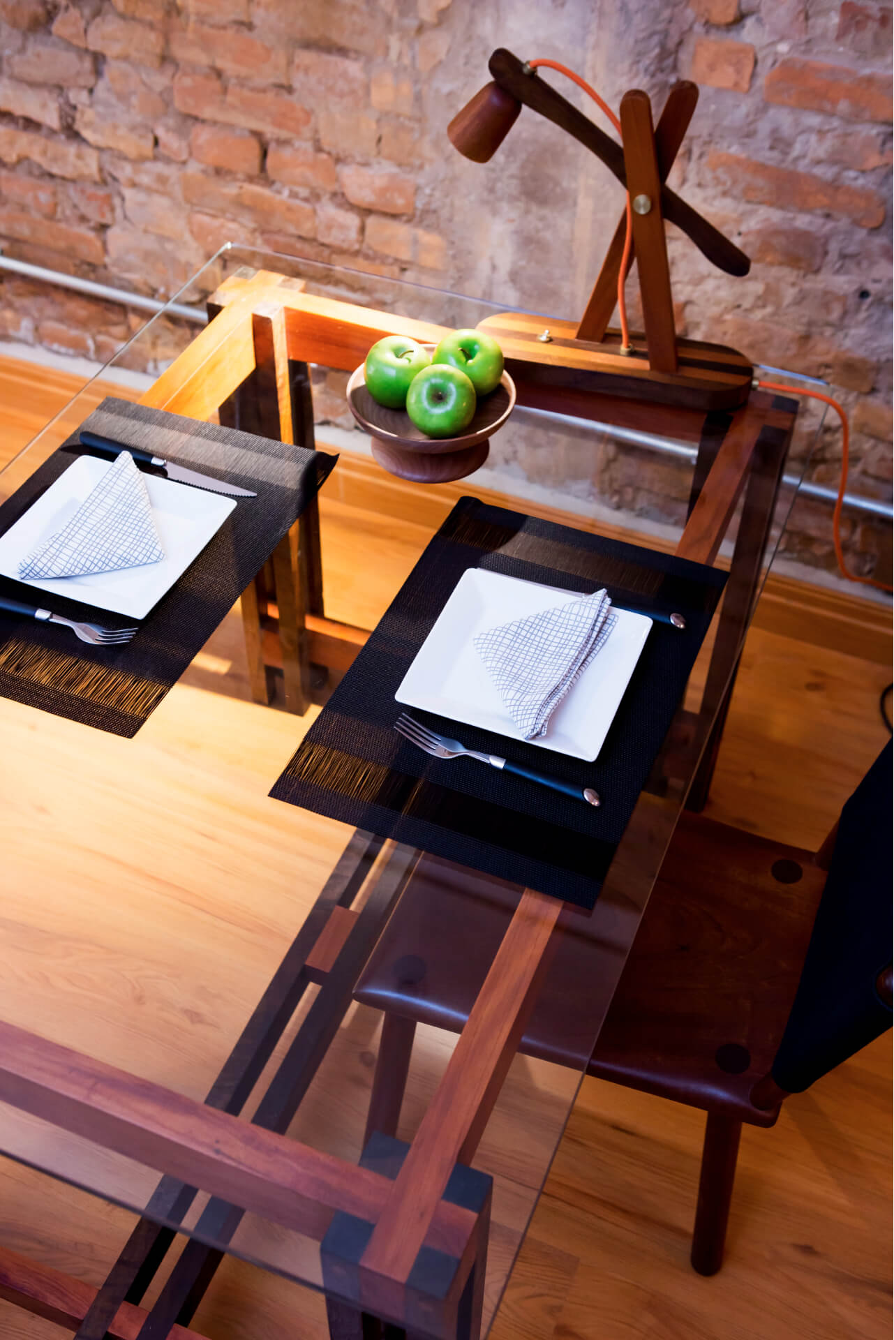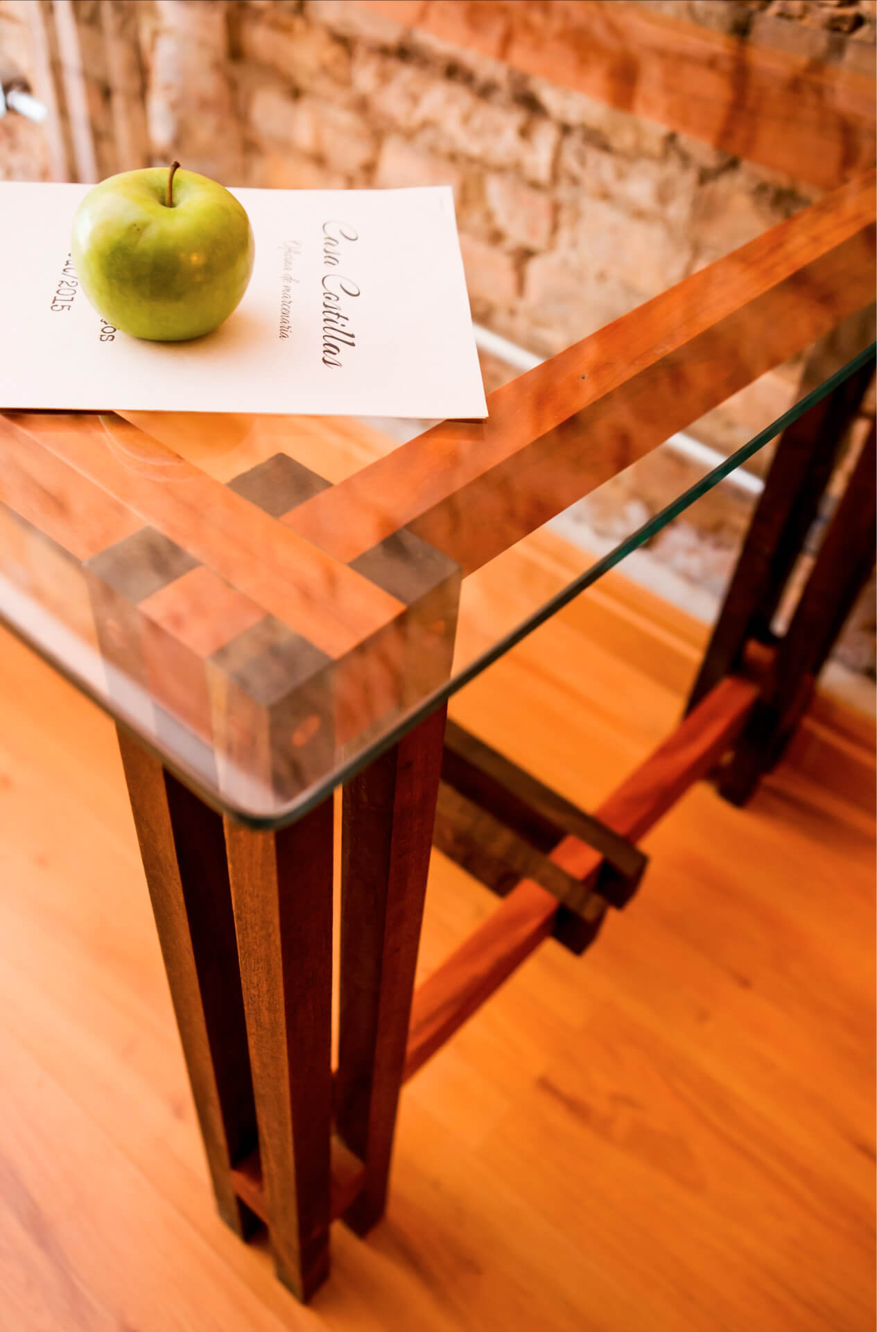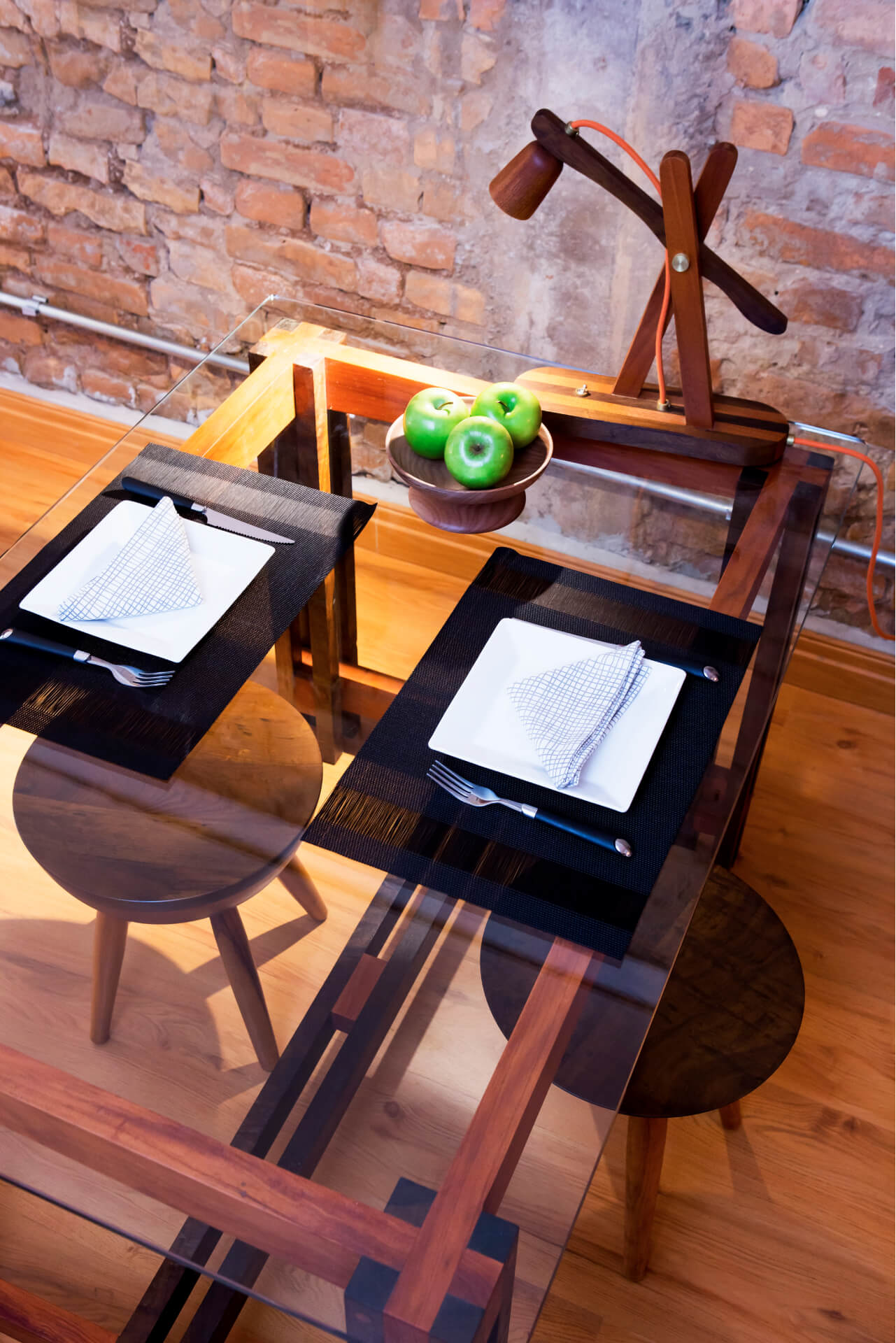 Elegante e robusta, sua estrutura exposta trabalha com os elementos vazados em seu desenho, pode ser utilizada como mesa de jantar ou mesa de trabalho.